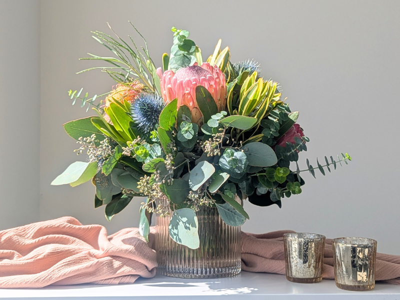 Order: A Native Table Centre in a glass vase is the perfect design for this long-lasting style.