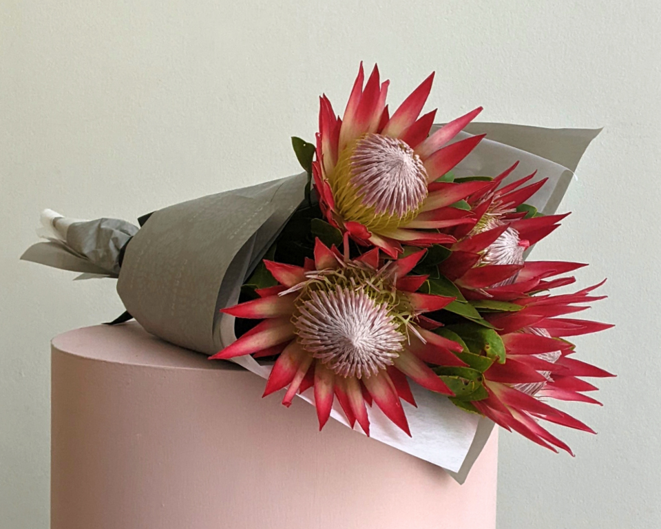 PROTEA: Native to South Africa they are grown locally and are perfect for Australian conditions. A florist favourite for their versatile shapes and colours and for their fantastic longevity. All shades of red, burgundy and pink, rustic browns and green and arctic white are available.They mix well with other flowers but look magnificent on their own - 3 king proteas in a vase is elegant and stylish! A cool florist tip is to mix proteas with seasonal flowers like roses or peonies for that juxtaposition of soft and strong that is so on-trend. The genus Protea was named in 1735 by Carl Linnaeus after the Greek god Proteus, who could change his form at will, because they have such a wide variety of forms. They are related to the grevillea family and ancient fossil evidence suggests that they grew 70 - 80 million years ago.