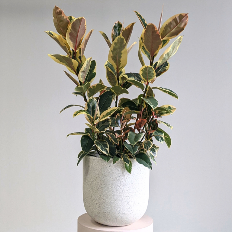 Ficus Elastica is an easy to care for plant with gorgeous variegated coloured leaves. Tough and low maintenance. Wipe the leaves once a month with a damp cloth to keep them dust free and looking fresh.