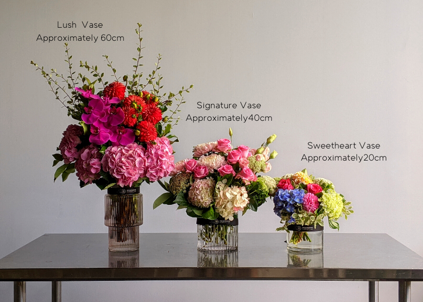 Floral signature vases - Lush Designs are approximately 50 - 50cm high. Our Signature Vases are approximately 30 - 35cm high.