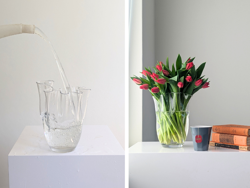 Flowers need plenty of fresh water to maintain their beauty (just like us!) Change the water every few days. Simply lift the flowers out of the vase. Trim the stems and remove any leaves that may fall below the water line. Give your vase a good clean out and refill with clean water. Pop your flowers back into the vase.